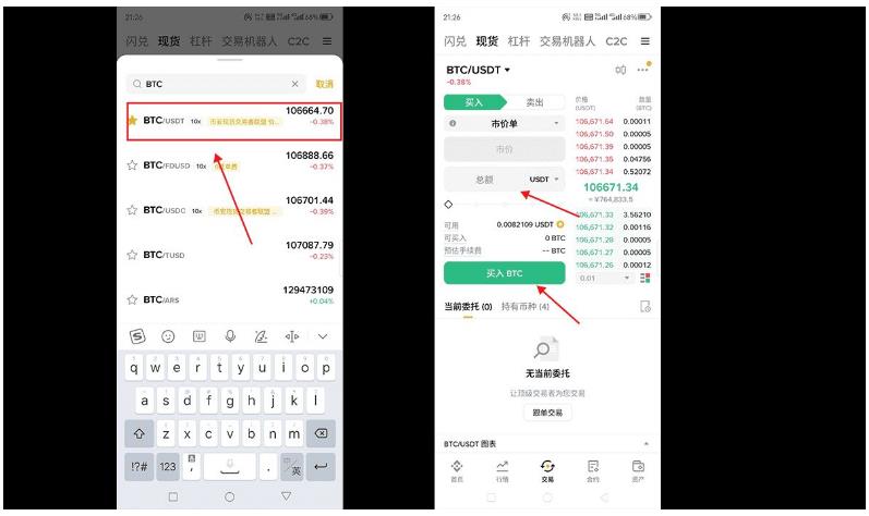 在“资产”页面检查,确保您的USDT等在 “交易账户” 中。如不在,需先通过“资金划转”从“资金账户”转入,此操作即时免费。在APP底部点击 “交易”,进入现货交易区。在搜索框输入“BTC/USDT”这样的交易对。