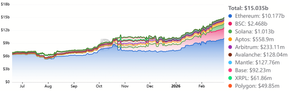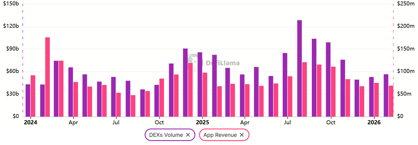 以太坊DEX交易量在2026年2月降至565亿美元,较2025年8月的峰值1285亿美元显著下降。在同一期间,Solana的月交易量达到955亿美元,较8月的1206亿美元下降。这一活动收缩对网络费用和去中心化应用(DApp)收入造成了压力,有效减少了持有以太币的直接激励。