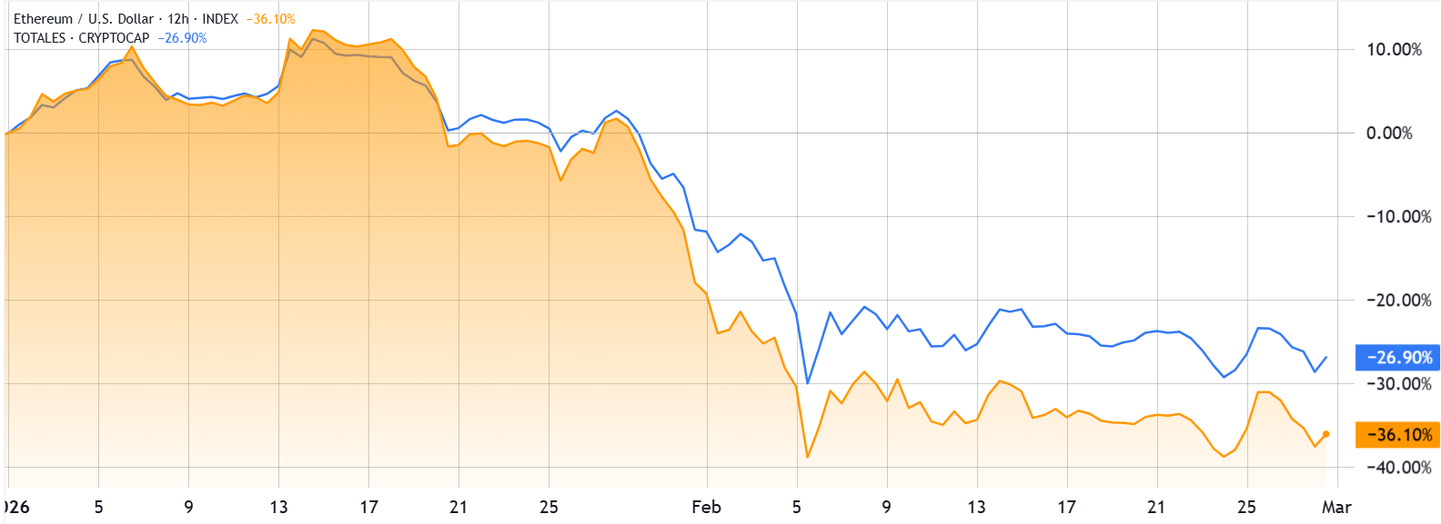 ETH/USD(橙色)与总加密货币市值(蓝色)。来源:TradingView